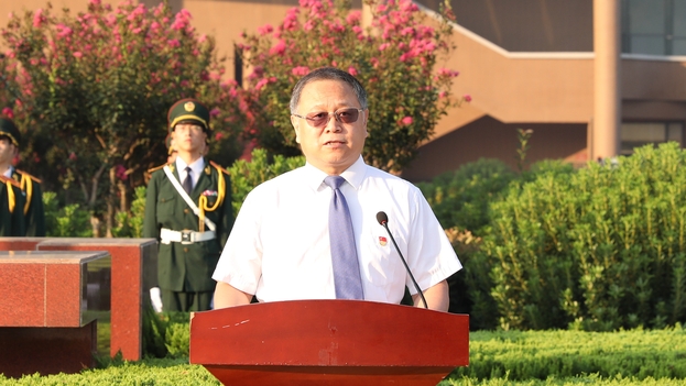 杨捷说,2020年是不平凡的一年,新冠肺炎疫情给人类社会带来了巨大冲击。疫情发生以来,中国共产党坚持人民至上、生命至上。全国人民众志成城,共克时艰,疫情防控取得了重大胜利。无数医护工作人员、人民子弟兵、公安干警、社区志愿者成了我们心中的最美逆行者,他们在非常时期,不畏艰险,坚守岗位,有些人甚至付出了自己的生命。在这些英雄中间也有我们的三全学子,郝莺歌、李鋆等四名同学,在疫情爆发之时,义无反顾选择最美逆行,坚守在武汉防控一线;朱飞阳、王静等4名同学毅然请命抗疫一线,奋不顾身,忘我奉献。站在国旗之下,我们无比的激动,为诞生在这个伟大的国度而自豪,为诞生在这个伟大的时代而骄傲。