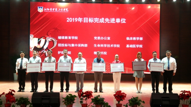 在雄壮激昂的国歌声中,大会拉开了序幕。吕莎首先宣读了《新乡医学院三全学院关于表彰2019—2020学年度先进集体和个人的决定》。获得表彰的有新冠肺炎疫情防控工作先进教师36人,优秀抗疫学生团队2人,优秀党员志愿者10人,2019年目标完成先进单位8个,2019年进步奖3个,2019年创新项目奖3个,2019年优秀教研室奖19个,2019年度十佳人物10人,2019—2020学年优秀教师117人。校领导分别为获奖单位和教师颁发荣誉证书。