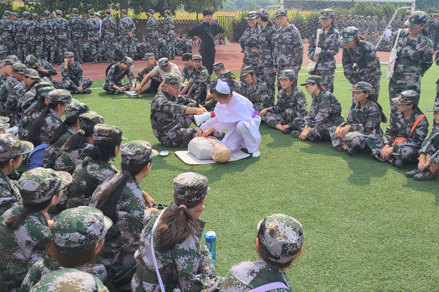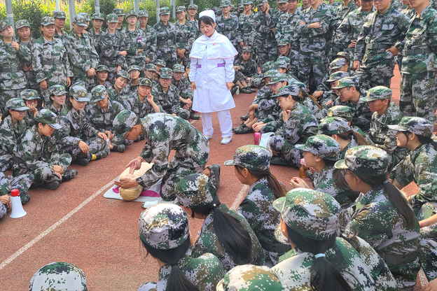 本次培训介绍了心肺复苏的意义,着重强调了“时间就是生命”,人人都要会心肺复苏技术,才能在关键时刻挽救生命,然后详细讲解了单人徒手心肺复苏的规范操作流程,并针对易错之处进行一一纠正,学生们回到军训场地开始心肺复苏术练习。按照连队编制共分为10个培训小组,每一小组由学生助教进行示范操作,并邀请新生现场进行实际操作。新生们在学生助教和老师的指导下认真完成好每一个动作,纠正每一个错误,基本掌握了心肺复苏术的基本流程和规范手法。