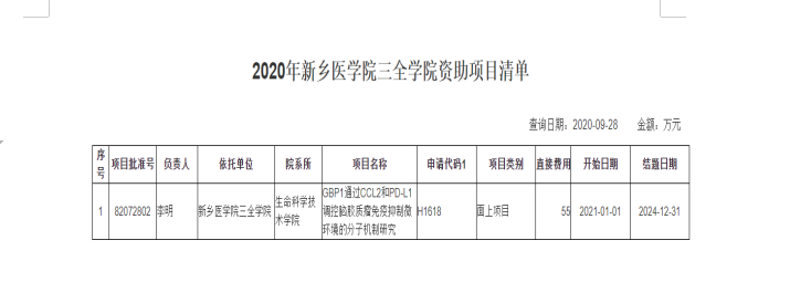 近日,国家自然科学基金委员会公布了《关于2020年度国家自然科学基金申请项目评审结果的通告》,我校李明教授的《GBP1通过CCL2和PD-L1调控脑胶质瘤免疫抑制微环境的分子机制研究》获准医学科学类立项,资助经费55万元。这是我校建校以来首次获批国家自然科学基金面上项目,实现了自然科学研究国家级项目零的突破。