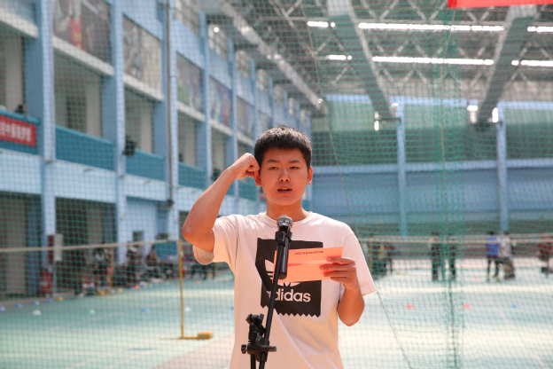 参赛运动员代表德馨书院陈彪宣誓。他表示将以积极饱满的热情参与本届运动会,严格遵守比赛规则和赛场纪律,服从裁判,尊重对手,团结协作,公平竞争,充分发挥自己的竞技水平!