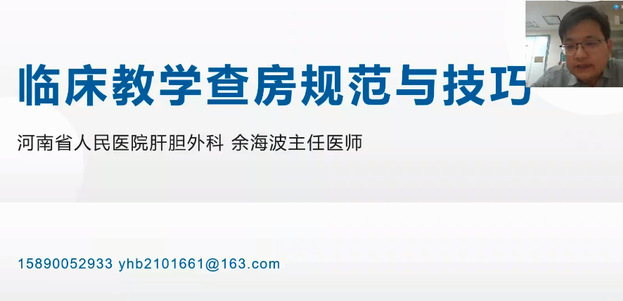10月28日,在联盟众多医务工作者的期待中,余海波以“临床教学查房规范与技巧”为主题在腾讯课堂进行了本次培训的第一次直播讲座。余海波是河南省人民医院肝胆胰腺外科主任,郑州大学、河南大学硕士研究生导师,河南省卫生科技创新型人才知名中青年专家。在课堂中,余海波认为教学查房要严格依托临床真实病例展开,并从病例的选择、教学方式方法的选用、问诊查体病历的书写三项基本功展开详细阐述。