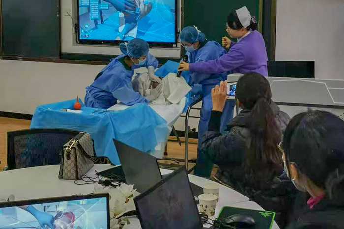 在专家报告环节,南方医科大学护理学院助产系负责人、中国妇幼保健协会助产士分会常务委员兼副秘书长翟巾帼博士分享了南方医科大学在混合式教学改革中的经验,围绕护理(助产)专业挑战与创新、混合式教学改革发表了观点。来自福建水立方三维数字科技公司的代表陈强现场讲解了智慧教学资源在助力医学专业课程混合式教学改革中的作用。最后,我院助产教师团队基于“虚实结合、以虚补实”的原则,借助虚拟仿真技术,选择了现实教学中不易开展、传统实验教学较难达到教学效果的实训模块-分娩期处理,进行了现场案例互动与情景模拟。与会专家和教师进行了热烈讨论和现场实践。会后全体与会代表对我校护理实践教学中心进行参观交流。