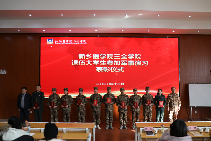 会议开始,顾欢和孙林为我校参加2020年“某军事训练”中表现突出的刘欣,郑浩然等10名退伍大学生颁发奖励证书,并与他们合影留念。