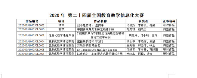 其中我校护理学院乔美琪的《中国传统舞蹈训练之眼神训练》、基础医学院周艳琳的《T细胞及其介导的适应性免疫应答模块混合式教学案例》、杨全中的《蛋白质的结构与功能》、王秀菊的《对映异构及其命名》分别荣获典型作品;药学院马矜烁的《我不是药神,是药事》、外语系付新玉的《An Impressive English Lesson》、基础医学院常晓宾的《以疾病为中心的混合式教学模式应用》分别荣获研讨作品。