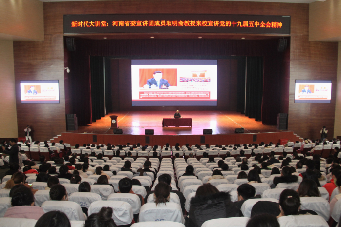 学校党委制定《深入学习贯彻党的十九届五中全会精神实施方案》,先后邀请河南省宣讲团成员耿明斋教授、省委党校姚巧华教授来校宣讲十九届五中全会精神。各基层党组织通过专题党课、知识竞赛、视频接力、话剧及舞台剧等方式深入学习贯彻落实全会精神。校党委还带领广大师生开展党史、新中国史、改革开放史、社会主义发展史及新冠肺炎疫情防控知识宣传教育活动,通过“红十月”主题教育活动月、红色电影周、“四史”知识竞答、专题教学、思政微课、“朗读者”视频接力等线上线下活动,号召师生“以史为鉴知兴衰不忘初心跟党走”,以高质量党建引领学校新发展。