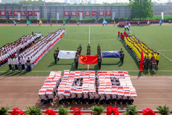 随着激昂的进行曲,精彩的入场式正式开始,英姿飒爽的国旗护卫队迈着慷慨稳健的步伐,展现了三全学子良好的精神风貌,紧随其后的国旗队、彩旗队、裁判员队、各书院以及教职工代表队等24个工会代表方阵喊着铿锵有力的口号依次闪亮登场。他们“排兵布阵”,不断拼出1921、2021、100、党徽、爱心等字样和图案,向中国共产党成立100周年献礼,表达对祖国母亲的热爱。庄严肃穆的国歌响起,全体肃立,行注目礼,奏唱国歌,运动会正式拉开序幕。