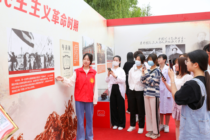 “大家好,现在我们所处的是第一展区“新民主主义革命时期”。请大家随我移步展区,本展区主要展示的是1919年五四运动至1949年开国大典中国共产党新民主主义时期的重大历史事件……”仪式后,在大学生新闻中心广播台讲解员的带领下,广大领导和师生开始有序参观各展区,接受“沉浸式”精神洗礼。