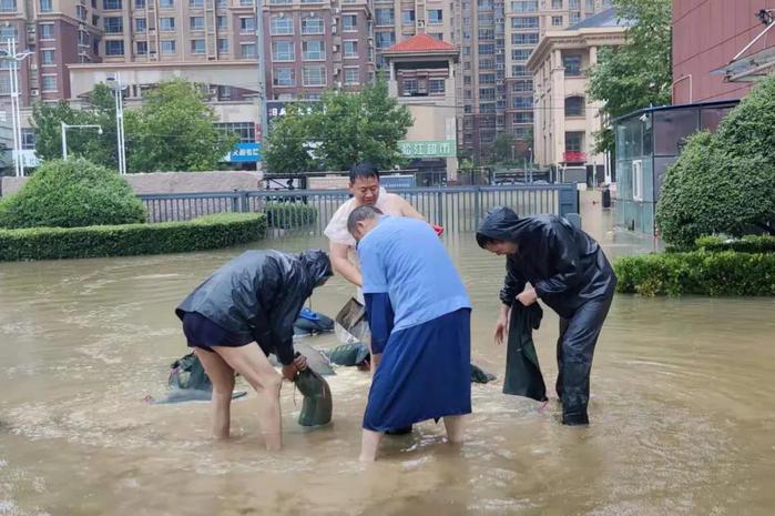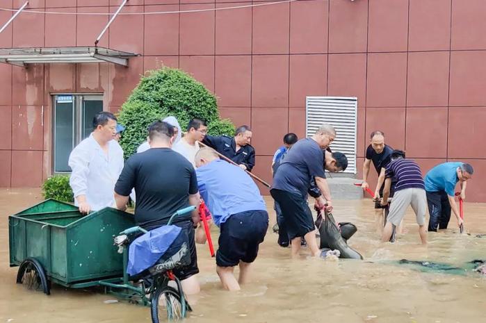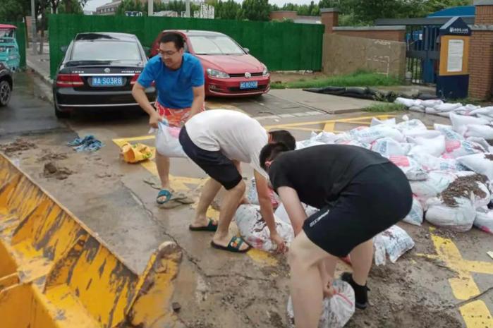 “由于新乡校区严重积水,现急需垒一道微型水坝,请在新乡校区附近居住的男同志,尽快赶往新乡校区。”7月21日上午,一道抗洪召集令在各单位工作群里发布。险情就是命令。书记院长第一时间赶往现场,职工们也纷纷请战,很快,就有18个教职工克服各种困难来到了现场。连天伟家在健康路附近住,离学校很远,听到这个召集令后,当即决定前去。他先是选择骑三轮车去,发现根本骑不了后,就决定走路蹚水去,还好路上遇见坐着拖拉机的宋静敏老师,幸运地搭上了顺风车。产教融合办公室主任助理王真真家住正阳花园,为了早点赶到学校,她先是从路边拦了一辆工程车,渡过积水最深的地方后,又从路边扫了一辆共享单车,然后又蹚着校门口齐腰深的水走进了校园。