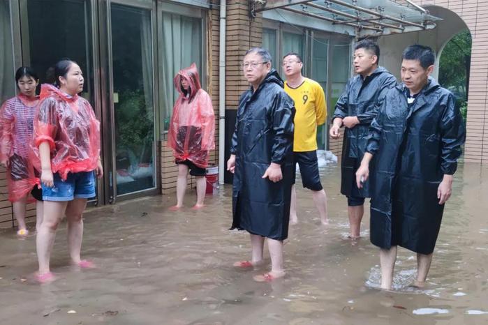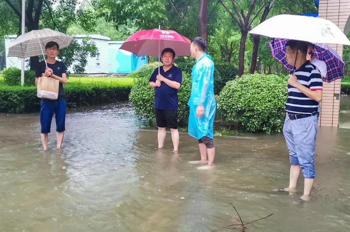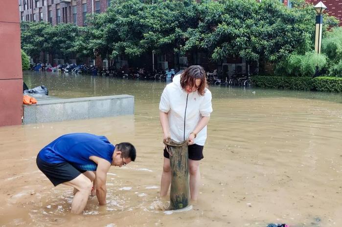 汛情严重,情况紧急,我校广大党员干部、教职员工踊跃投身抗洪抢险工作。暴雨发生后,我校迅速启动防汛应急工作方案。7月20日,校党委书记杨捷、院长胡仕坤第一时间赶赴现场,带领有关部门负责同志,在两校区各区域巡查,了解校园积水情况,现场指挥调度排涝工作。校领导要求,要守好教学和生活的关键区域,加强多部门协调沟通,克服各种困难,全力做好排涝工作。后勤保障先锋队、防汛救灾党员突击队要保障安全的前提下,继续奋战,为书院和院系提供紧急救援;校医院做好卫生防疫方案,积极做好灾后消杀,疾病预防等工作。各级党组织将防汛救灾与“我为群众办实事”活动相结合,按照定人、定岗、定时、定责要求,层层压实工作责任,用实际行动诠释使命担当,筑牢“红色堤坝”,全力保障学生师生人身安全、财产安全。向“险”而行,奋力冲锋。“平常时候看得出来,关键时刻站得出来、危难关头豁得出来。”在防汛救灾一线,学校总务部、基建部、后勤服务中心、新乡校区综合办公室等部门以及各书院的工作人员迅速组建“党员突击队”、设立“党员责任堤”,迎难而上、冲锋在前,哪里最困难、最危险,哪里有险情,哪里就有他们的身影。抢险人员24小时在岗坚守、昼夜奋战,用满身的雨水和泥泞,树起了一面面鲜红的旗帜,彰显了党员的责任与担当。