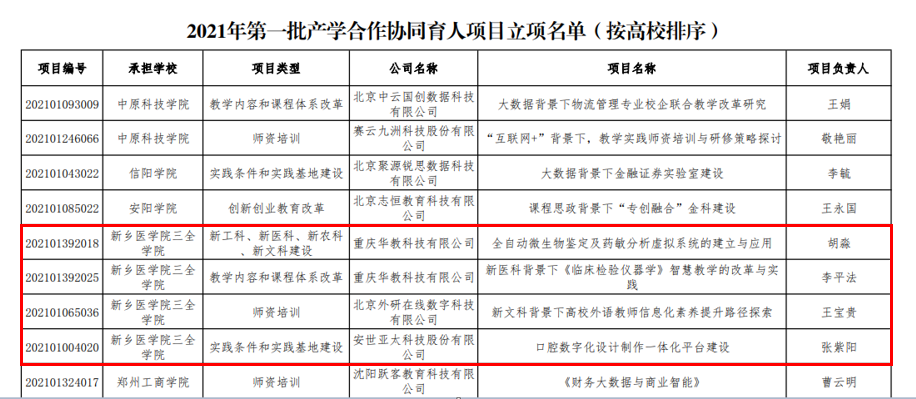 近日,从教育部发布的《教育部高等教育司关于公布2021年第一批产学合作协同育人项目立项名单的通知》(教高司函〔2021〕14号)获悉,我校李平法、胡淼、王宝贵、张紫阳4位老师主持项目成功获批立项。