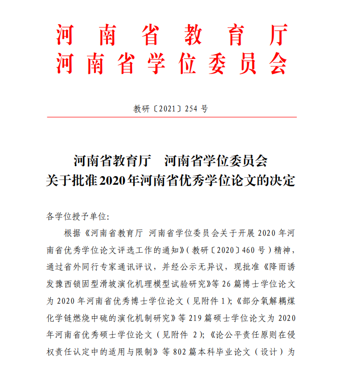 近日,河南省教育厅、河南省学位委员会发布了《关于批准2020年河南省优秀学位论文的决定》(教研〔2021〕254号 )文件,公布了2020年河南省优秀学位论文评审结果。我校王亚茹等14位同学撰写的本科毕业论文(设计)获2020年河南省优秀学士学位论文(设计)。