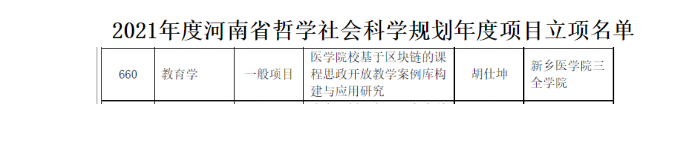 近日,河南省哲学社会科学规划办公室公布了《2021年度河南省哲学社会科学规划年度项目、决策咨询项目、专题项目立项名单公示》,我校胡仕坤教授的《医学院校基于区块链的课程思政开放教学案例库构建与应用研究》教育学项目获批立项。这是我校首次获批省部级社会科学类项目。