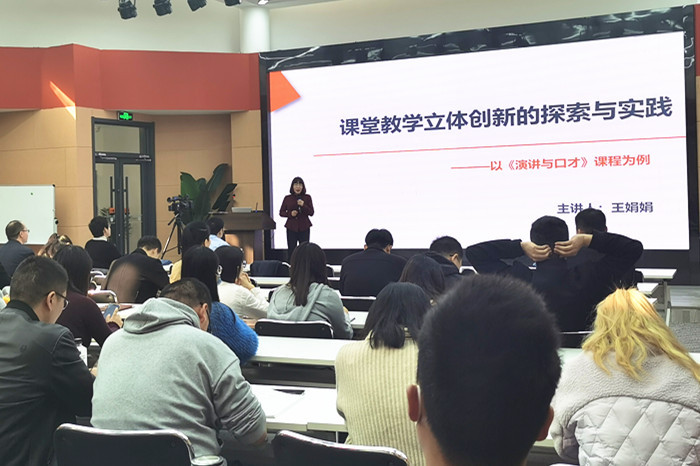 第二环节,王娟娟以“《演讲与口才》——演讲稿的实战技法”(本作品荣获河南省第二届本科高校教师课堂教学创新大赛教授组特等奖)为例进行示范性教学,以增强现场教师对课堂教学立体创新模式和方法的直观认识。