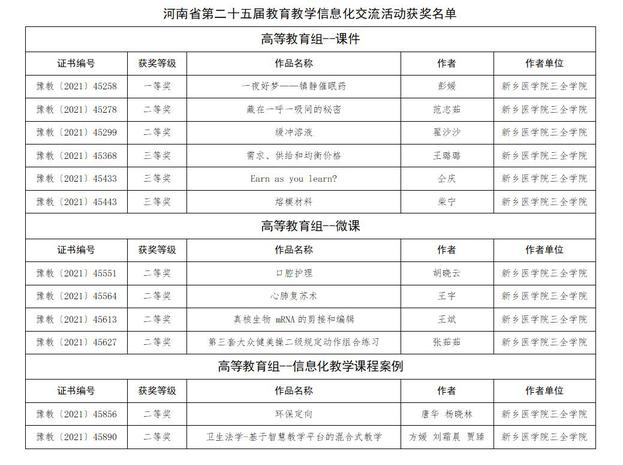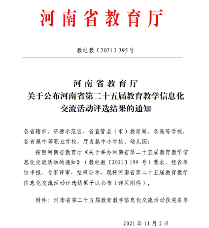 近日,河南省教育厅印发了《关于公布河南省第二十五届教育教学信息化交流活动评选结果的通知》(教电教〔2021〕)395号),我校共有12项作品获奖,其中一等奖1项、二等奖8项、三等奖3项。