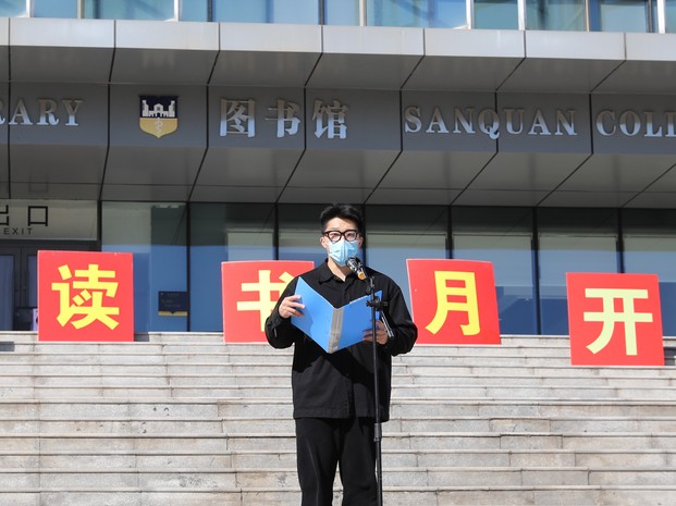 德馨书院2018级药物制剂专业孟祥熙作为学生代表上台发言。他倡议广大学子积极参与校园读书月活动,多读优秀书籍,多读名家大作,努力丰富知识,开阔视野,提升能力,熏陶品格,完善人格,不断增强文化自信心和民族自豪感。