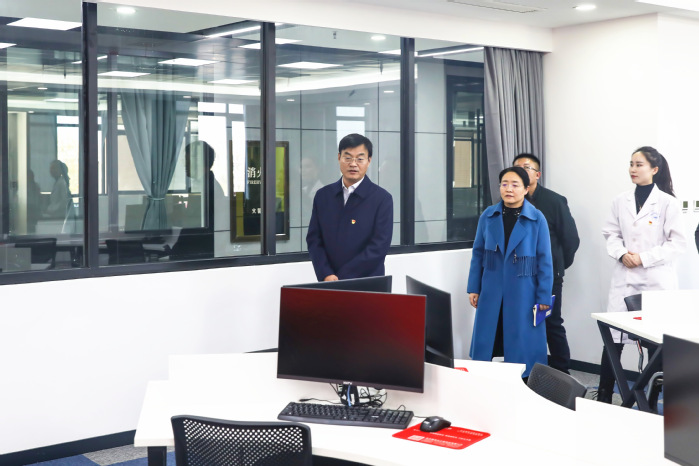 调研采取实地走访和座谈会相结合的方式进行。胡仕坤在智能医学工程学院相关负责人的陪同下赴智能医学工程实训中心,参观走访了医工综合实验室、新建的智能医学实验室和大数据实验室,结合专业建设,就实验室的需求和使用情况进行深入探讨与交流。