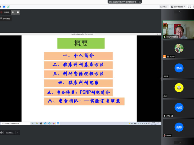 河南大学姬新颖教授以“临床医学科研的资源整合”为题做了专题报告。他从临床科研基本方法、科研资源挖掘方法、临床科研思维等方面展开讲述,并介绍了整合的结果:PCNP研究简介;最后,他分享了自己的团队以及取得的成果。