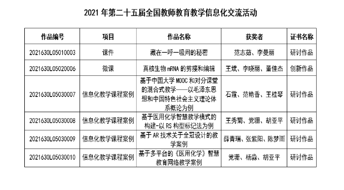 据悉,本届交流活动共收到31个省(区、市)和新疆生产建设兵团的课件、微课、信息化教学课程案例等作品4371件,经技术测试和专业指导教师推荐,共产生创新作品497件、典型作品1056件、研讨作品1502件。在这些作品中,我校基础医学院王斌的《真核生物mRNA的剪接和编辑》荣获创新作品;马克思主义学院石霞的《基于中国大学MOOC和对分课堂的混合式教学——以毛泽东思想和中国特色社会主义理论体系概论为例》、口腔技术学院薛青瑞的《基于AR技术关于全冠设计的教学案例》、基础医学院范志茹的《藏在一呼一吸间的秘密》、王秀菊的《基于医用化学智慧教学模式的构建-以RS构型标记法为例》、党珊的《基于多平台的〈医用化学〉智慧教育网络教学案例》分别荣获研讨作品。
