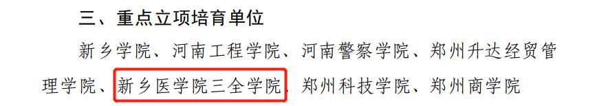 近日,河南省教育厅、河南省发展和改革委员会、河南省财政厅联合下发了《关于公布河南省博士硕士学位授予单位和学位授权点立项建设名单的通知》(教研〔2021〕420号),新乡医学院三全学院成功获批河南省硕士学位授予重点立项培育单位,这是我校在硕士单位立项建设以及学科发展上取得的可喜成绩。