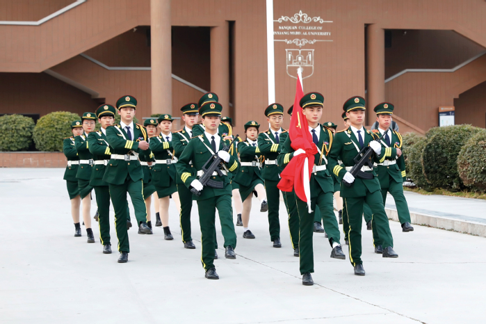 早上7时许,伴随着指挥员的口令,英姿飒爽的国旗护卫队队员迈着铿锵的步伐,护送着鲜艳的五星红旗来到国旗台下。随后,国歌奏起,旗手振臂一挥,将五星红旗抛向天空,全体观礼人员向国旗行注目礼。在振奋人心的国歌声中,国旗冉冉升起,飘扬在校园上空。
