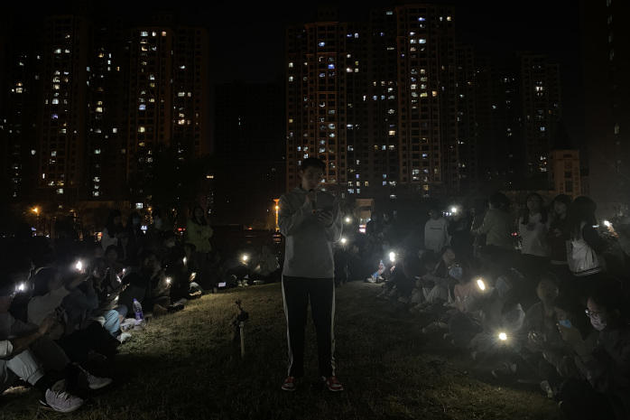 每天晚上,学生们会自发去风雨操场报到,在保持防疫安全距离的前提下跳广场舞,领舞的是基础医学院的老师耿梦丽。