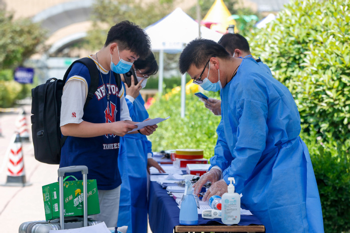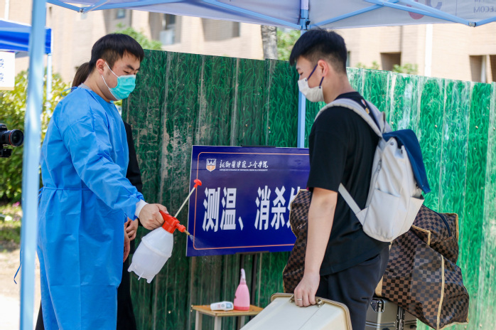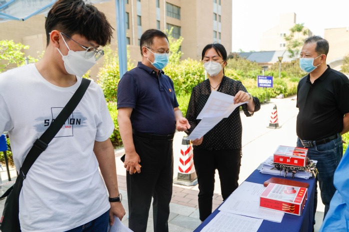 在新乡校区门口,返校考生按照疫情防控要求,扫码、消杀、测温后,方可通过专用通道进入学校。胡仕坤认真查看返校考生的入校情况,要求工作人员严格按照防疫程序,坚决把疫情阻挡在校园之外。按照14天健康监测要求,新乡校区将3号公寓楼设置为健康监测区,学生通过专用通道可以直达。在3号公寓楼前,精诚书院、崇德书院等书院分别设置了服务台,负责指导学生处理入校后各项事宜。胡仕坤依次来到各书院的服务台前,同返校考生亲切交谈,了解他们的所需所求,叮嘱工作人员要加强个人防护,提高安全意识,做好学生帮扶关怀工作,做好解疑答惑和困难排查工作,鼓励学生们摆正心态,积极复习,以良好的状态迎接专升本考试