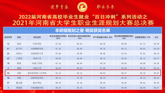 经过书院初赛推荐,学校复赛、决赛和豫北赛区复赛等环节,我校选手刘欣、尚航宇脱颖而出,代表学校参加河南省2021年大学生职业生涯规划大赛总决赛,与来自河南省52所的高校90名选手同台选手竞技,经过对《职业生涯规划书》、《职业生涯人物访谈报告》评审和PPT、职业角色情景模拟展示和现场答辩等环节,我校选手尚航宇荣获银奖,刘欣荣获铜奖。