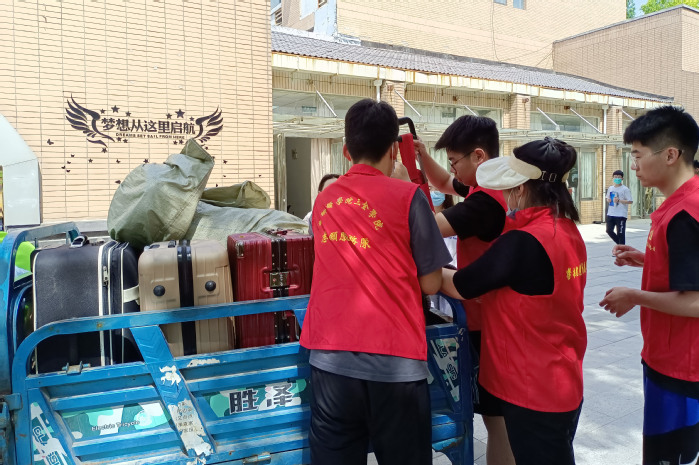 扛包裹、搬运行箱、装车……5月28日一大早,德馨书院即将离校的学生发现,书院内多了一支穿着红马甲的志愿服务队。这支服务队成员有老师、有学弟学妹,更让他们意外的是,还有校领导身影。