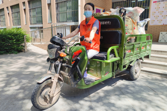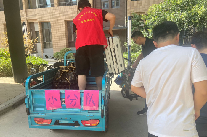 从精诚书院到乘车点有些远,考虑到学生搬运行困难,精诚书院的宿管阿姨们不仅加入了书院组建的志愿服务队,还主动贡献出代步工具——电动三轮车,热情地帮学生把行运到校门口。