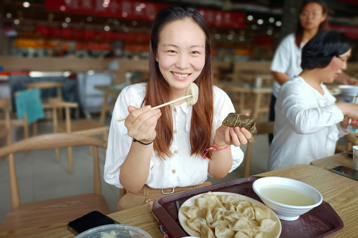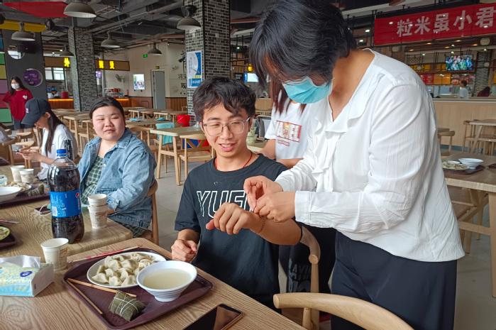 即将赶赴郑州实习的葛瑶说,来到食堂后,发现这里不仅有饺子,还有煮好的粽子。最让她感动的是,老师亲手给他们每个人系上了红线绳。