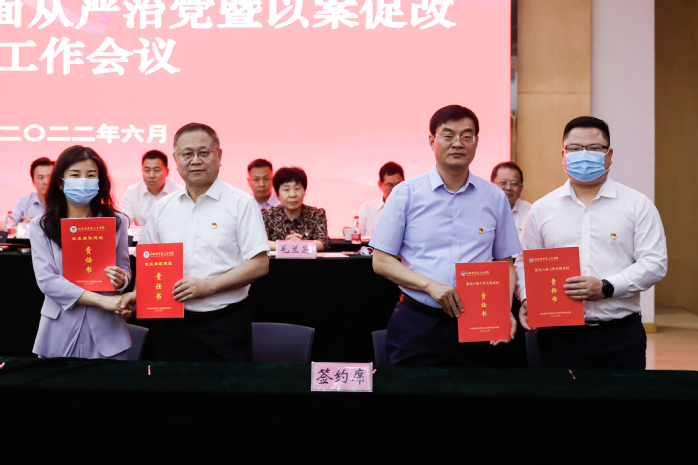 党委书记杨捷指出,学校党委始终坚决贯彻落实党中央决策部署和上级工作要求,以政治建设为统领,持续把全面从严治党引向深入,学校各项事业发展保持良好态势。他表示,在过去的一年,学校总结经验、发扬成绩,进一步推进全面从严治党向纵深发展,主要体现在以下几个方面一是学校党的政治核心作用全方位加强,在常态化疫情防控以及去年“7·20”防汛救灾等特殊时期,共同守护了校园安全和师生生命健康安全;二是学校以理论武装为根基,校领导班子成员深入基层讲授思政课50余次,促进了党员干部理论素养和工作水平的提升,进一步拧紧理想信念总开关;三是以担当作为践行初心使命,全年开展40余场调研,坚持落实整改问题,极大促进了学院办学水平提升,书写第一责任的三全答卷;四是以监督执纪为推手,组织签订责任书、实施校内巡查工作、开展重点单位廉政约谈,将权力运行的笼子进一步扎紧,深化党风廉政建设和意识形态工作责任末端落实到位;五是以提质增效为重点,坚持民主集中制,严格落实集体领导和个人分工负责相结合制度,坚持重大事项集体讨论决定,进一步创新推进党组织建设。