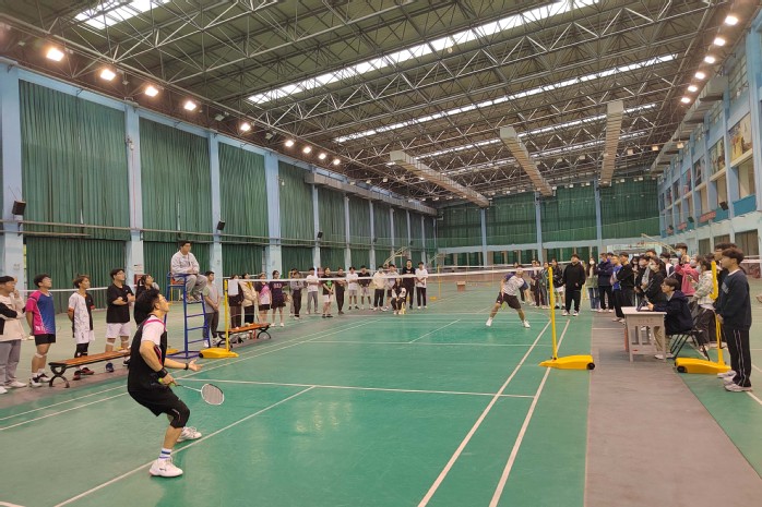 上午的首场比赛项目是羽毛球,比赛以男子单打双打和女子单打双打的形式进行。随着裁判员的一声令下,第一场比赛正式开始,参赛队员们矫健的身姿,熟练的动作,赢得了在场同学的欢呼与呐喊
