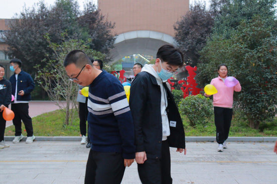 你追我赶、互不相让, 背对背用身体将气球夹住,中途不得球掉落且不能夹破球。参赛选手们正在紧张的练习着,讨论上场的技、战术,以潘龙老师和学生马鑫组合的十支部战队,娇憨可爱的身姿,心有灵犀的配合,一骑绝尘奋勇向前冲向终点。此次活动在轻松愉悦的气氛中落幕,温馨互动的氛围展现团体的凝聚力和向心力,放松了心情、舒缓了压力。