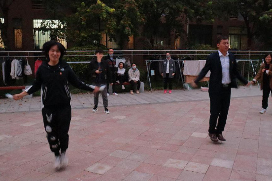 绳舞展英姿,脚尖一点地,双腿抬起来,双手抡起跳绳,绳子打在地上“啪啪”直响,跳绳从头上掠过好像一个光环。武占玲老师正在与学生PK跳绳;“还有30秒坚持住”主持人大声的宣报时间。激情与紧张齐在,友谊与比赛同存,欢乐的氛围、活跃的气氛,拉近了师生“革命友谊”,比肩同行,共命运、心连心,齐心协力共克时艰。