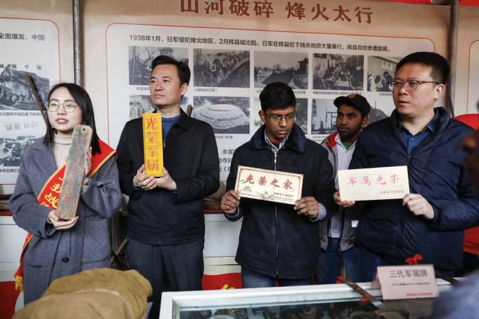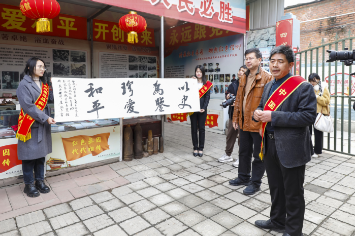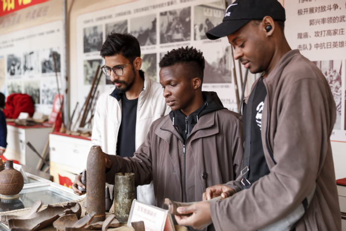 上午,全体师生首先来到本次系列活动的第一站——耿风泉抗战实物展览馆。在耿风泉先生的带领下,国际学生们一边参观馆内珍贵的战争实物,一边聆听这些藏品的由来和收藏故事。斑驳的水壶、生锈的步枪、笨重的土地雷都在生动地诉说着战争的艰辛岁月,展示着中国人民坚强不屈的意志。耿风泉一家三代都是军人,这个家族坚守初心,收集的万余件物品长期向社会免费开放,坚持义务为观众讲解,他们无私奉献、胸怀家国,深深感染到了在场的每一个人,同学们深刻体会到现在的幸福生活来之不易。来自加纳的Felicia非常感动地说:“看到这么多战争实物,让我感受到了战争很艰苦,我现在觉得和平很好,现在的生活很幸福。”参观尾声,耿风泉先生还向国际学生赠送了著名美术家娄鸿泰红色书法作品“珍爱和平”,鼓励国际学生们做和平的使者,把中国和平共处的理念传播到全世界。