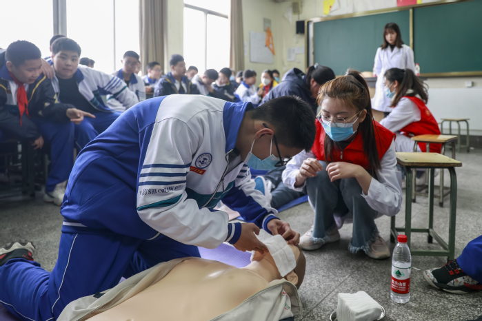 袁磊指出,我校作为省内医学卫生类的高校,担负着培养基层卫生人才的责任,也应该为青少年安全健康教育发挥应有作用,我们要建立“大手拉小手”急救培训的长效机制,持续开展青少年安全急救培训,通过培训活动让青少年学生们熟练掌握心肺复苏的操作流程与操作要点,正确实施救助,挽救生命。
