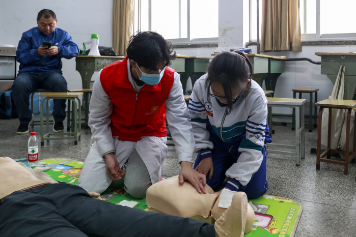 仪式结束后,经过分组,各班主任带领每组的师生志愿者进入班级,为初一年级12个班级近700余名学生们开展心肺复苏实操培训。各位教师通过生动的讲述将心肺复苏整个流程具体化、形象化,包括如何判断生命体征、如何有效呼救、胸外按压的手法、如何开放气道等,通过形象的表演告知学生们错误的操作方式,引来大家的欢声笑语,在寓教于乐的环境中将操作注意事项以及专业知识操作传达给学生们。接着,志愿者们为各位同学进行操作演示,与老师们共同指导,一位一位地查看学生们的操作,手把手地纠正错误,使每位同学切实掌握心肺复苏这项基本急救技能。