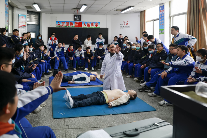 3月25日上午,我校“心肺复苏”实操培训“青少年生命安全教育基地”揭牌仪式在河南师范大学附属中学举行。我校党委副书记马帅、副院长袁磊、河南师范大学附属中学副校长侯伟等出席,临床学院12名专业教师及25名大学生志愿者担任急救培训老师。