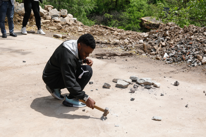 接着,国际学生进行了“翻山越岭”游戏和碎石体验等各趣味活动切身体会当年郭亮人开凿挂壁公路的艰难辛苦,深刻感受太行人民凝神聚力、艰苦奋斗的伟大精神以及太行人民的伟大智慧。随后师生们一起拜访了“十三壮士”之一郭亮村原党支部书记宋保群。国际学生围坐在一起,认真聆听76岁宋老先生讲参与开凿绝壁长廊的故事。宋老先生回忆:“石头太硬,打钎时直冒火星,3天才打了1米多深。”但是他们坚信绳锯而木断、水滴则石穿,在耗费4000多根铁锤、12吨铁钎,历时5年时间后终于在峭壁上打通一条1250米长的“幸福之路”。听到此处,国际学生鼓起热烈的掌声。宋老先生的讲述深深地打动着在场的每一个人,听完故事后,国际学生纷纷向宋老先生伸出大拇指。
