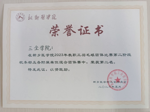 5月22日,新乡医学院2023年教职工羽毛球团体比赛顺利落下帷幕。我校教职工羽毛球队努力拼搏,积极进取,一路过关斩将,最终5胜1负,斩获团体二等奖历史最好成绩。