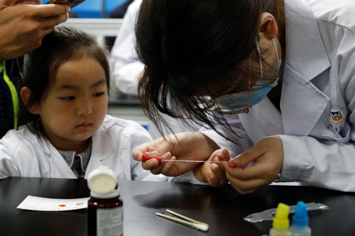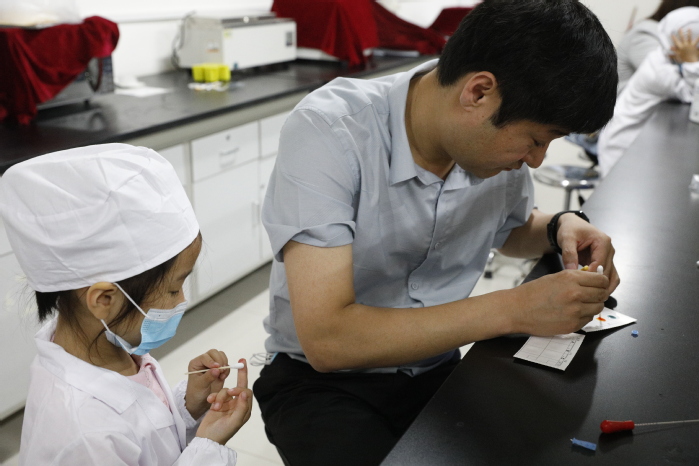 “通过将采集到的爸爸妈妈的指尖血,加入A型和B型血清当中,来观察凝集现象判断血型。”面对着一个个看着自己的好奇目光,医学检验学院的杜纪英老师耐心地向孩子们讲解如何血型鉴定,孩子们也都被血液与试剂的神奇反应所吸引。通过展示有趣的检验化学实验,让孩子们感受到科学实验的魅力,了解到做实验是需要科学严谨的态度和认真仔细的观察,在他们心中悄然种下了医学的种子。