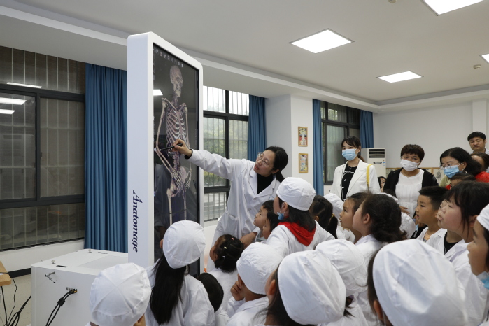 “苗苗老师我知道我是在妈妈肚子里长大的!““苗苗老师我想看一下我们吃进的食物都去了哪里呢?”人体解剖学虚拟仿真实验室里,孩子们带着好奇提出各种问题,人体解剖学副教授苗莹莹利用虚拟仿真解剖台耐心地为孩子们进行解答。在讲到妈妈十月怀胎带来的身体变化时,告知孩子妈妈十月怀胎的辛苦,让孩子们张开紧紧的拥抱妈妈对妈妈说一声”您辛苦了”。通过对骨的有机成分和无机成分讲解,告知孩子们老年人无机质含量高,脆性增加而易骨折。教导孩子们在日常生活中关爱老人,身体力行的去帮助老年人。通过并通过人体骨架复原小活动,让孩子们进一步了解我们人体关节的组成和常见脱位方式。通过人体奥秘探究让孩子们感叹生命伟大,教育孩子珍爱生命、珍爱健康