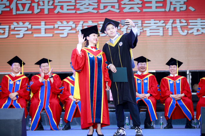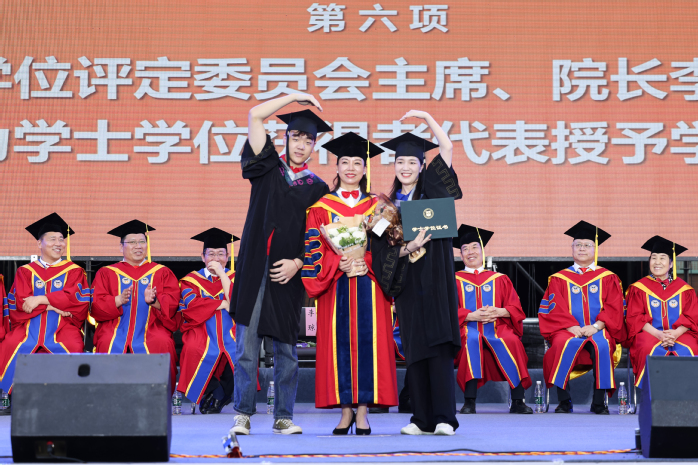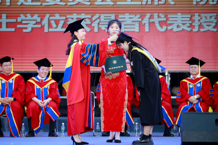 在神圣庄严的气氛中,学位评定委员会主席、院长李琼教授为学士学位获得者代表拨正流苏,授予学位证书。