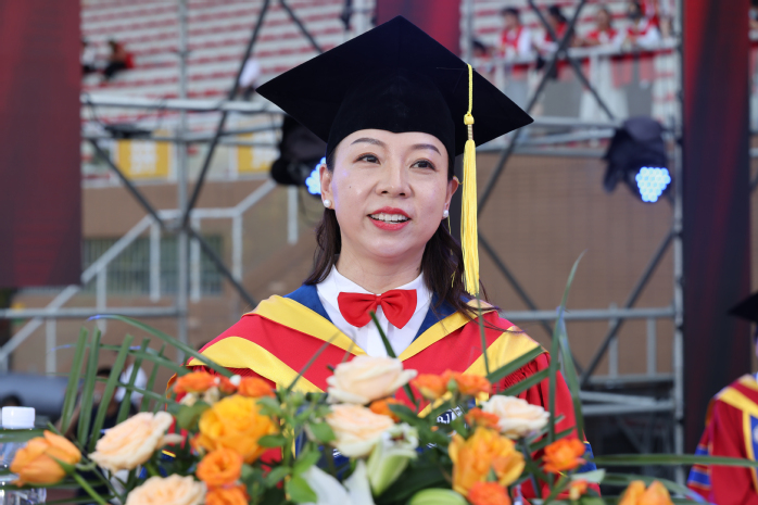 教师代表薛松梅教授发言。她从极不平凡的大学生活追忆面对“疫情”和“洪水”的逆境,炼就了十八般武艺。她送给三全学子三句话:有所爱——以仁爱之心做人;有所为——以责任之心做事;有期待——胸中有梦向未来。她勉励毕业生不断学习,与时俱进,适应社会的变迁,保持对新鲜事物的兴趣,保持提升自我的习惯,立于潮头,不断前行。