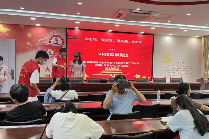 学生第二党支部赴新乡市高新区启明社区开展“VR体验学党史,红色宣讲进社区”活动。支部志愿者们为社区居民详细讲解了VR设备的操作技巧,大家听得饶有兴趣,争先恐后地体验高科技的魅力,沉浸式体验让大家对抗日战争、解放战争、党的二十大等红色知识有了更深刻的领悟。