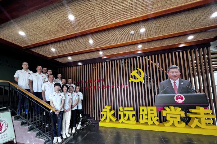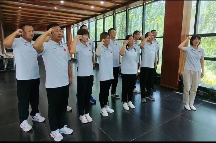 来到党员教育基地中心,在体育部直属党支部委员任盼红同志的领誓下,全体党员举起右拳、面对鲜艳的党旗,重温入党誓词,以铿锵有力的宣誓声,表达“不忘初心、牢记使命”的坚定信心,将共产党员的责任担当融入到铮铮誓言中。