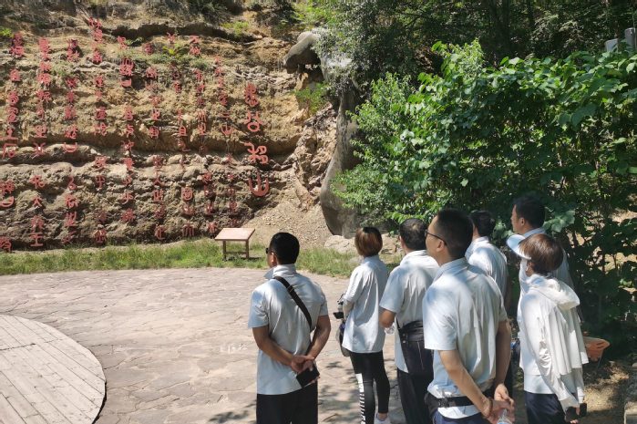 在愚公雕像处,大家瞻仰愚公雕塑,老愚公铿锵有力的铁臂铜拳,毛泽东“愚公移山,改造中国”苍劲有力、气势恢宏的题词,让全体党员教师深刻认识到“开天辟地、敢为人先、百折不挠、挖山不止”的愚公精神,身临其境地感受愚公移山精神的强大。