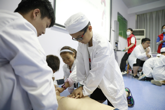 活动中,小学生们陆续步入光明眼科学院、医学影像学院、护理学院,志愿者们结合眼体模具,生动趣味地讲解眼睛预防知识;结合影像学专业知识,进行超声实验仪器的示范讲解;手把手指导应急救护步骤,学习心肺复苏的抢救要领,小学生们一边听讲解、一边实践,时不时提出问题,钻研劲头十足。