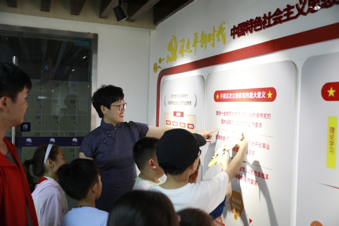在志愿者的带领下,小学生们走进了我校新时代学习馆。志愿者宁郑洋结合少年儿童特点,以“童言童语”的形式,从党的二十大主题、党的二十大报告思维导图以及党的二十大对未来作出的战略部署进行讲解,增强少年儿童对党的政治认同、情感认同和实践认同。